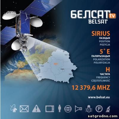 Телеканал "Белсат TV" транслируется со спутника "Sirius" (позиция 5˚ E, поляризация H, частота 12 379,6 МHz) и "Astra 1KR" (позиция 19,2˚ E, поляризация H, частота 10773 MHz).